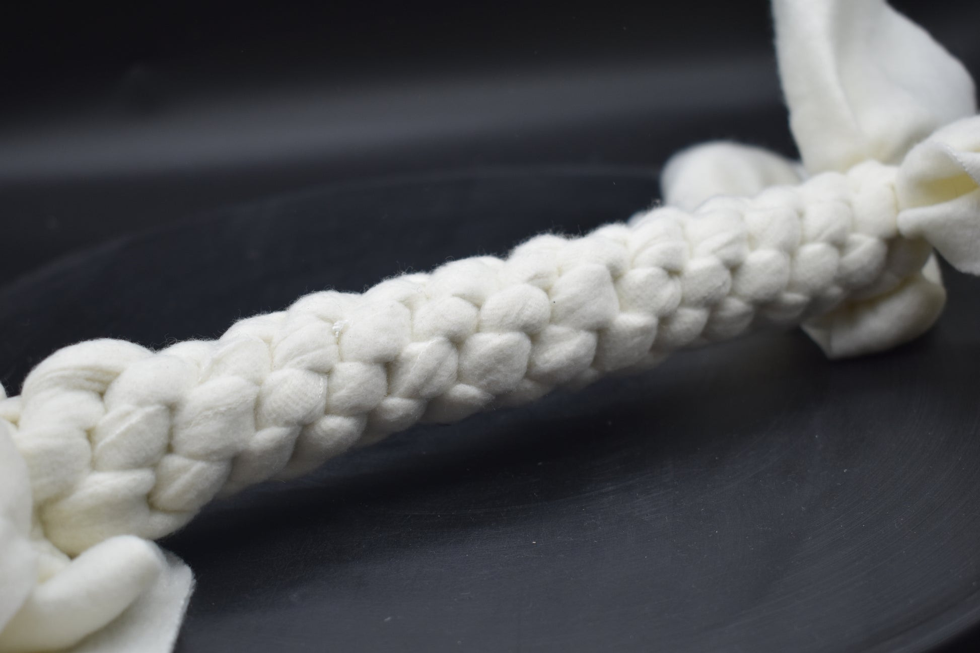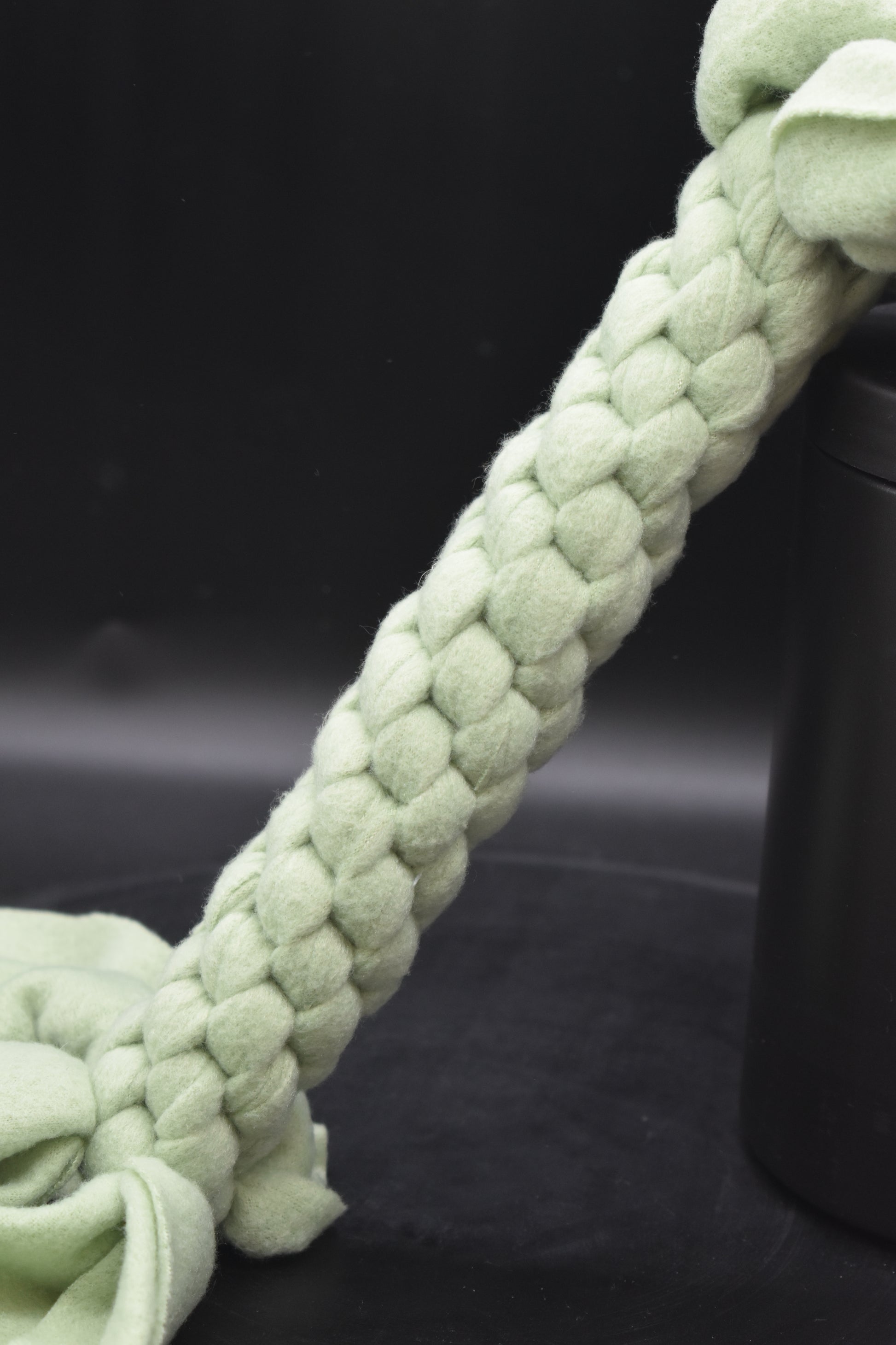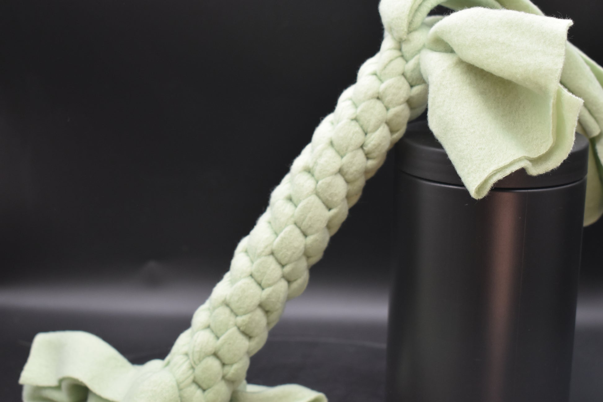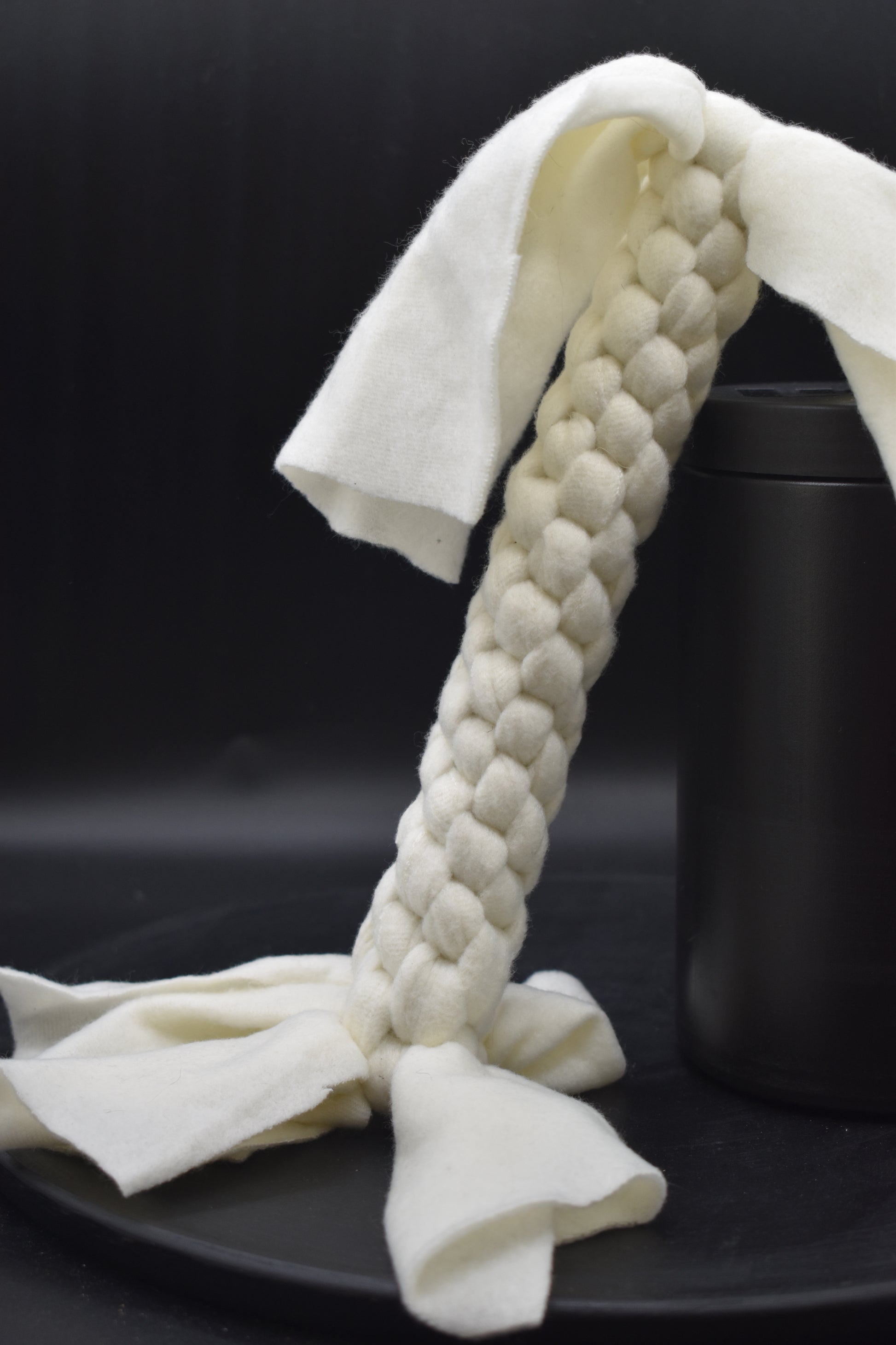 Entdecke unseren handgeflochtenen Zergel aus robustem Fleece – perfekt zum Spielen, Zerren und gemeinsamen Spaß haben mit deinem Hund. Durch die stabile Flechtweise hält er auch wilderen Zieh- und Apportierspielen stand und liegt dabei angenehm in der Hand.
