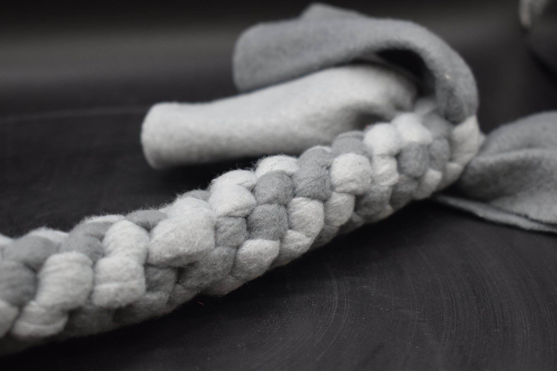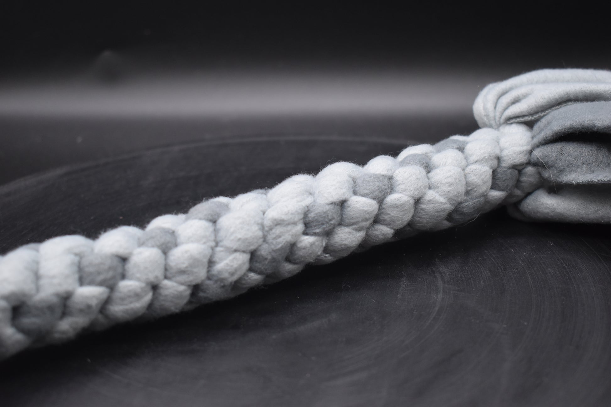 Entdecke unseren handgeflochtenen Zergel aus robustem Fleece – perfekt zum Spielen, Zerren und gemeinsamen Spaß haben mit deinem Hund. Durch die stabile Flechtweise hält er auch wilderen Zieh- und Apportierspielen stand und liegt dabei angenehm in der Hand.
