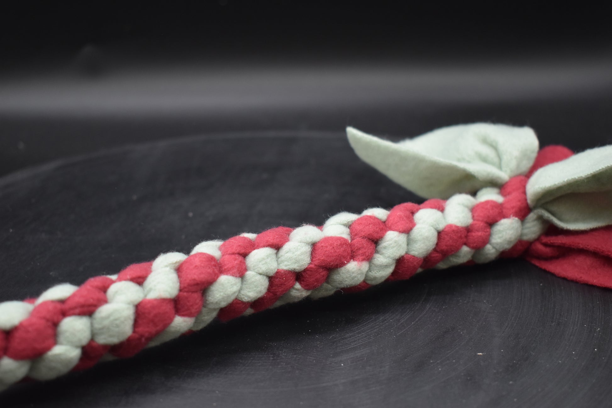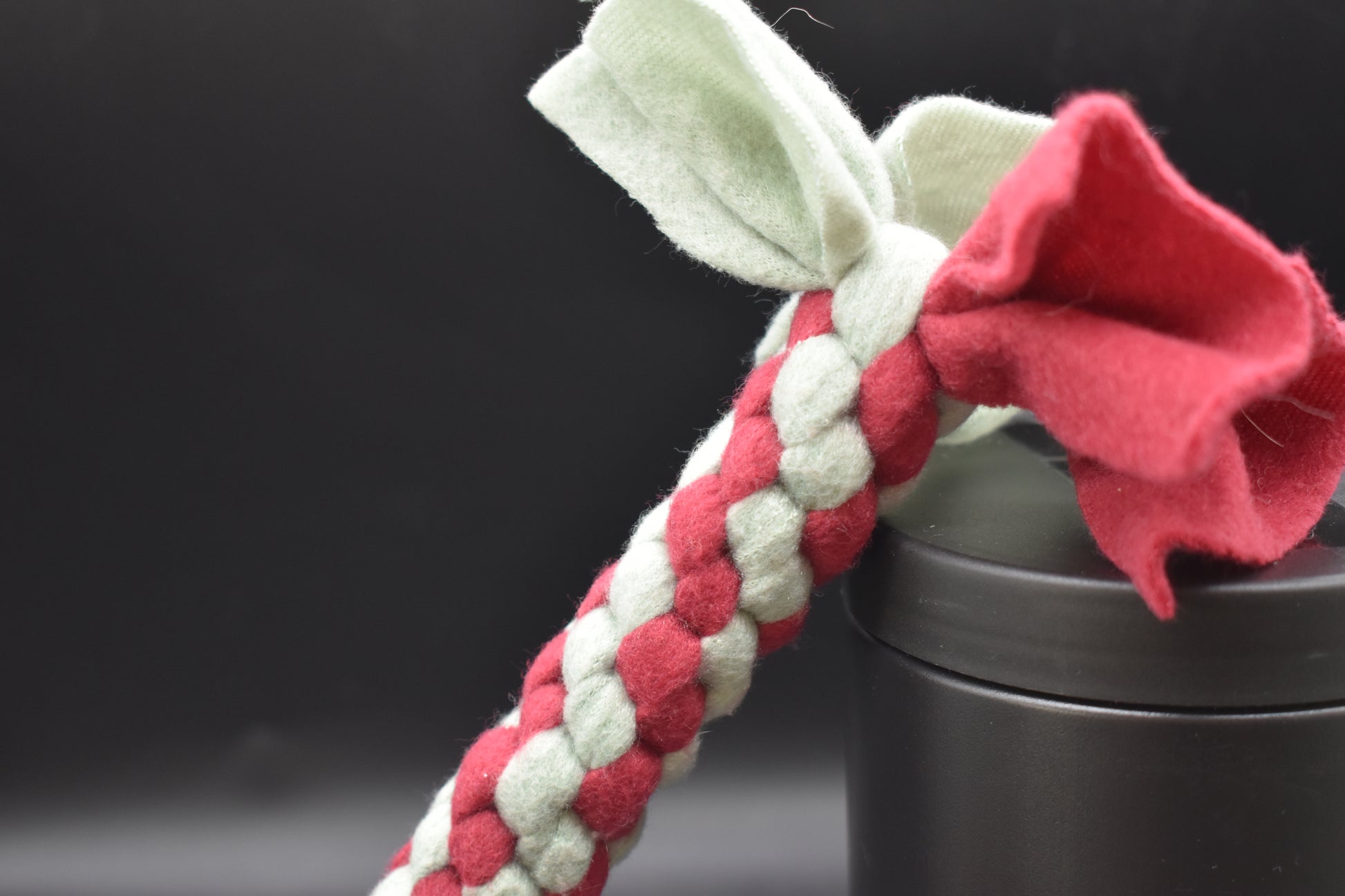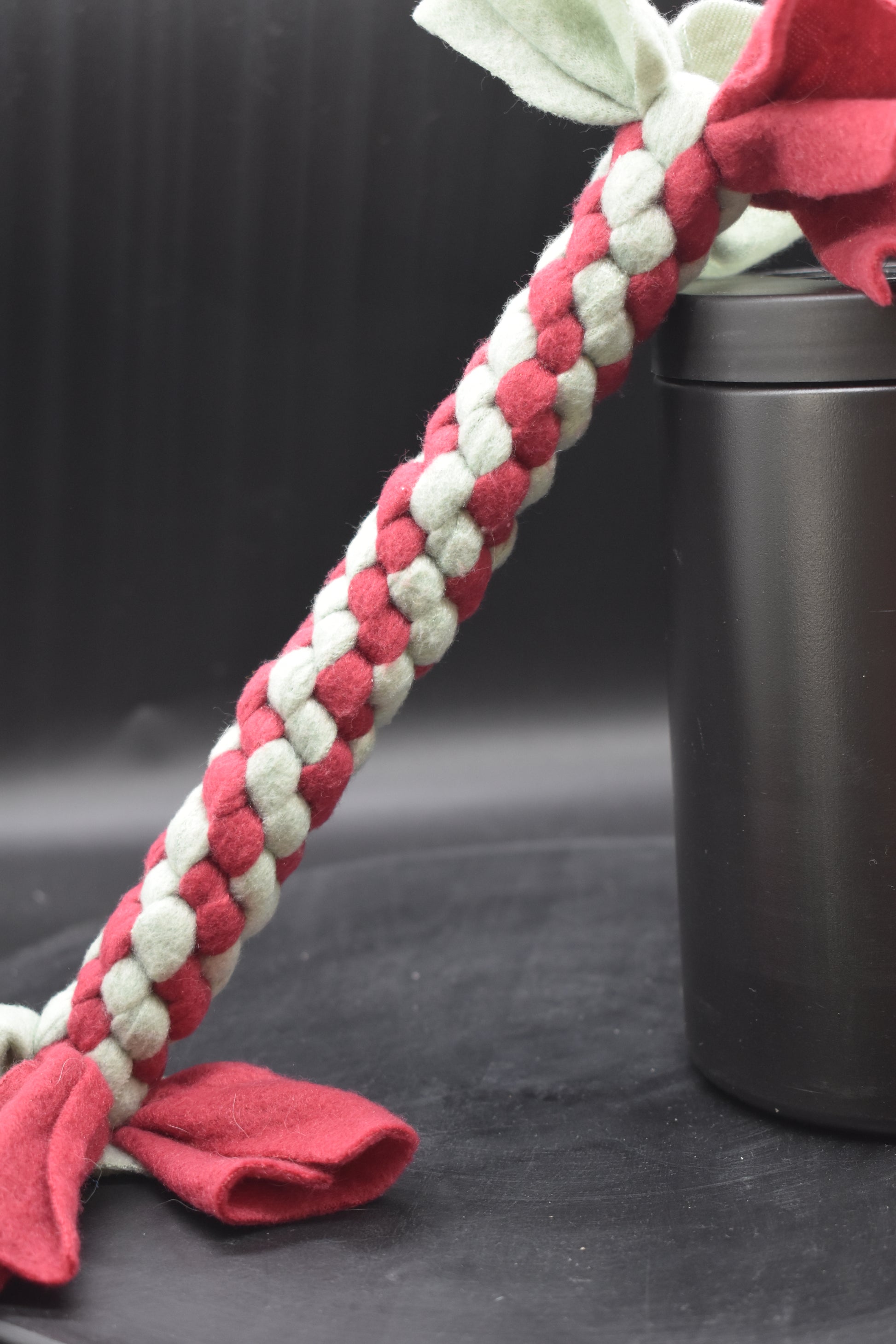 Entdecke unseren handgeflochtenen Zergel aus robustem Fleece – perfekt zum Spielen, Zerren und gemeinsamen Spaß haben mit deinem Hund. Durch die stabile Flechtweise hält er auch wilderen Zieh- und Apportierspielen stand und liegt dabei angenehm in der Hand.