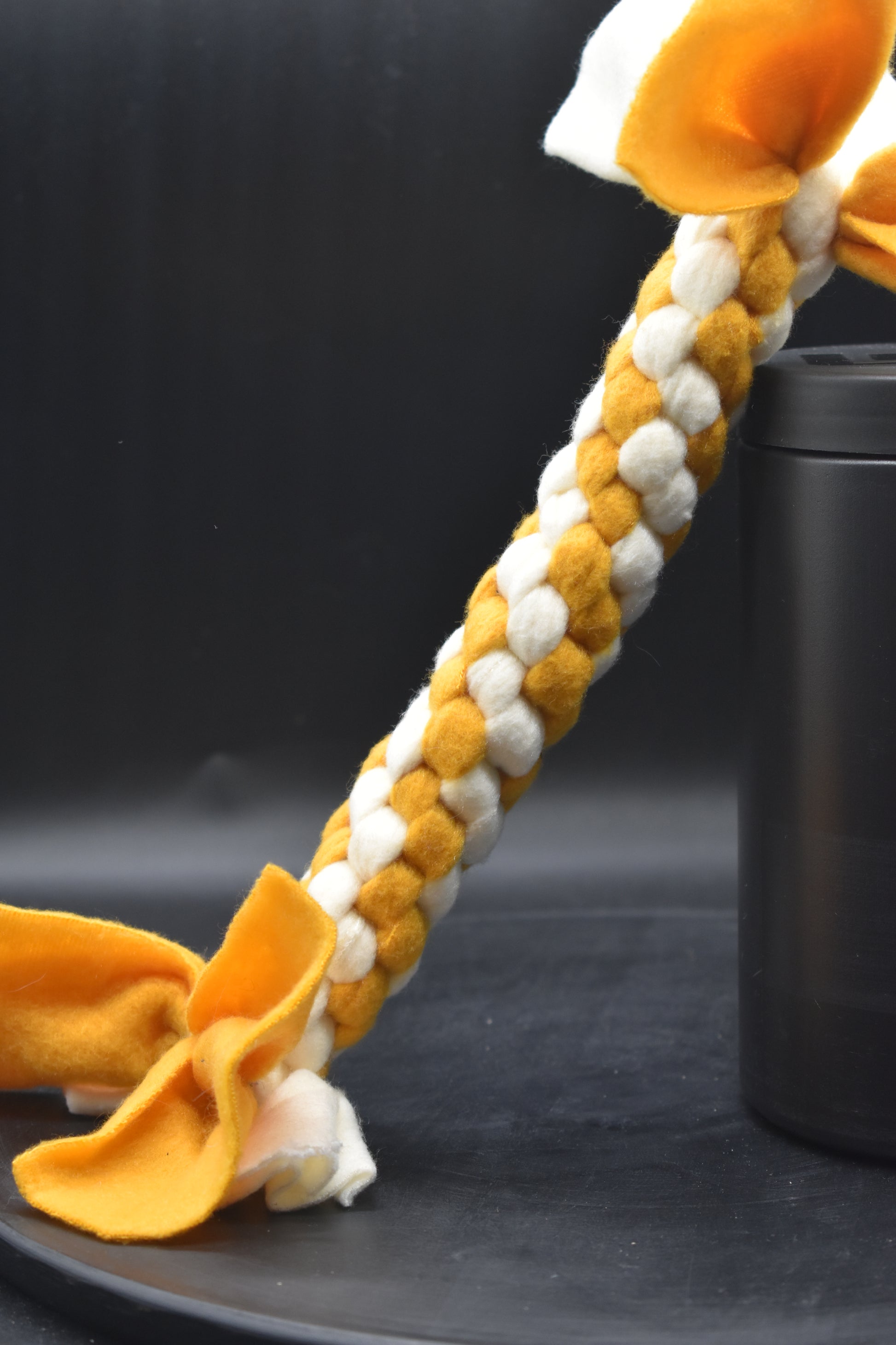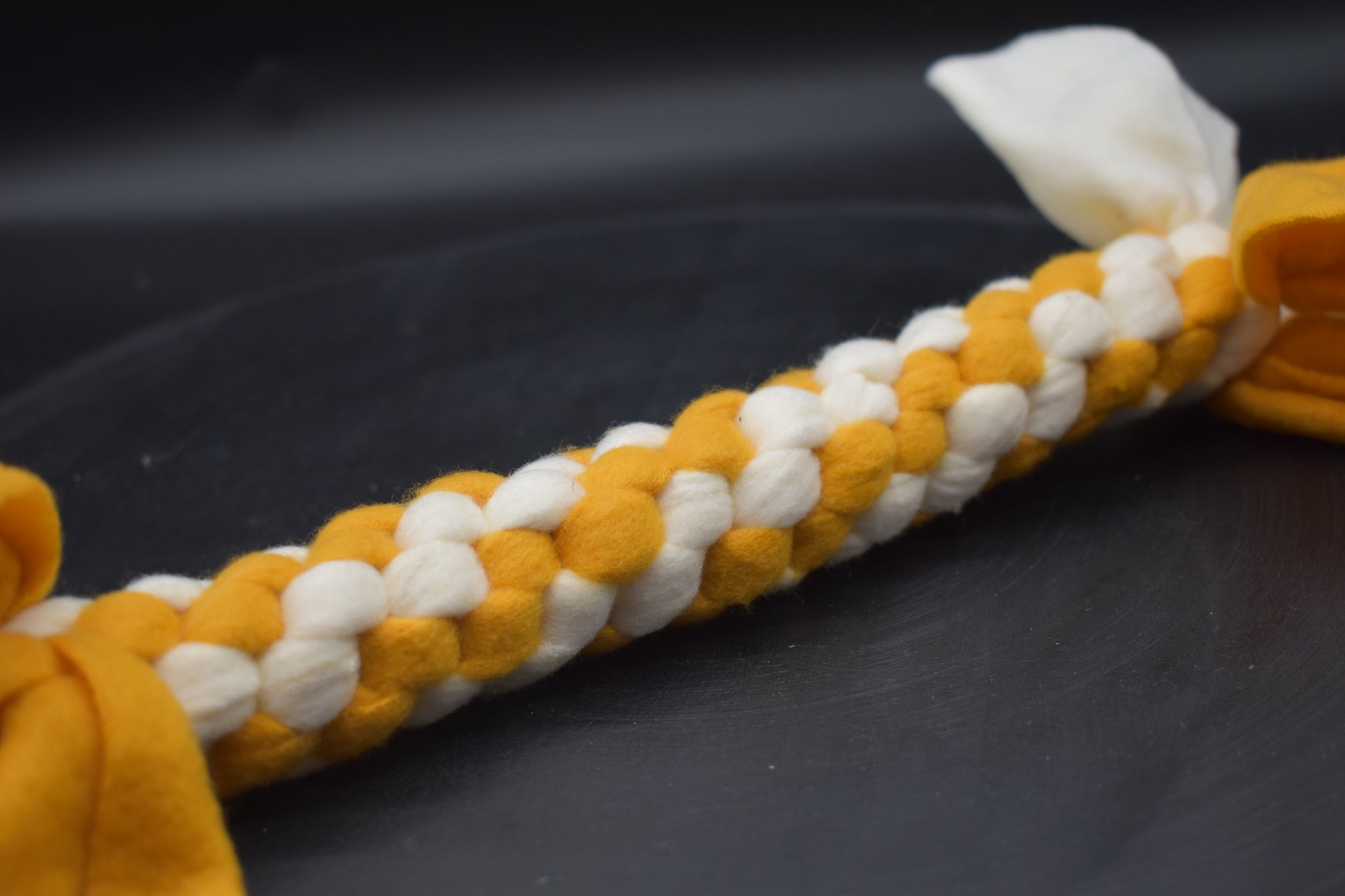 Entdecke unseren handgeflochtenen Zergel aus robustem Fleece – perfekt zum Spielen, Zerren und gemeinsamen Spaß haben mit deinem Hund. Durch die stabile Flechtweise hält er auch wilderen Zieh- und Apportierspielen stand und liegt dabei angenehm in der Hand.